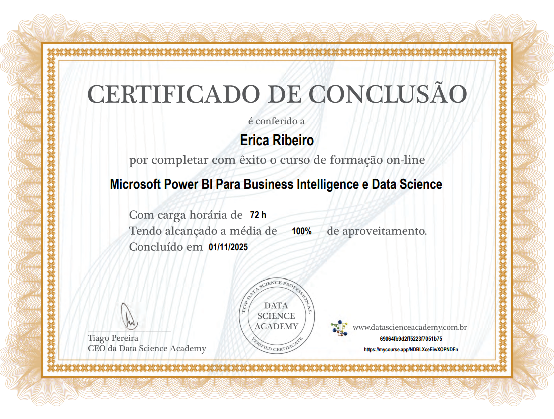 Tenho desenvolvido continuamente minhas habilidades em Análise de Dados, atuando na transformação de dados em insights estratégicos para o negócio. Trabalho com Power BI (Desktop e Service), Power Query e Metabase na construção de dashboards interativos e na modelagem de dados, utilizando SQL e DAX para garantir análises consistentes e eficientes.